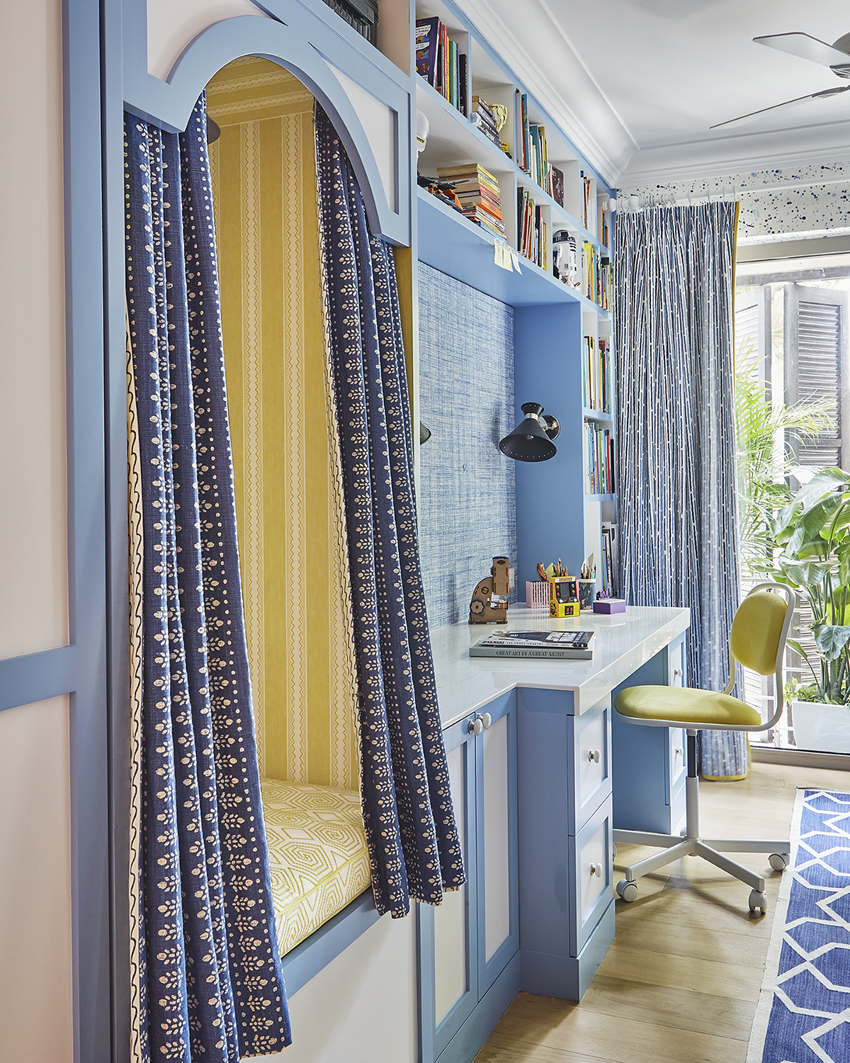 Their forever family home, this is the first property that the clients have purchased in Singapore. They wanted to create an apartment that felt happy and full of colour, whilst remaining light and easy to live with. The aim for the main living and dining area, as well as for the master bedroom, was to create an atmosphere of calm serenity and relaxed elegance, through the use of textured layers and interesting furniture shapes. In the children’s bedrooms, and in the clients’ studies, we injected a playful sense of fun using colour and detail; with each space retaining its own individual character whilst also flowing smoothly from room to room.