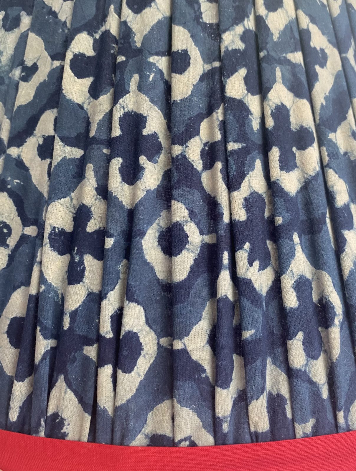 Our beautiful new series of hand-made pleated lampshades are made out of block printed fabrics created by artisans in Rajasthan. The lampshades are lined with a white cotton and are contrast-bound at the top and bottom. They come in US finial fitting and UK/EU gimbal fitting (with an E27 fitting and a B22 adaptor).